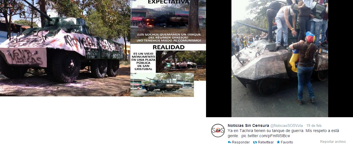 En Tachira, los manifestantes opositores han destrozado un monumento que constaba de una vieja tanqueta y posteriormente la cruzan en la carretera y hacen pasar el acto como una victoria sobre la GNB al haber, supuestamente, capturado la tanqueta a la policía durante los enfrentamientos: