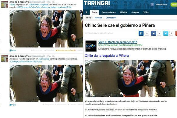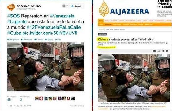 Twiteros opositores y medios de comunicación hacen pasar por venezolanas, imágenes de protestas estudiantiles ocurridas en Chile hace unos meses. Nuevamente los uniformes de los agentes, así como la fecha de las fotografías delatan la falsedad de la información: