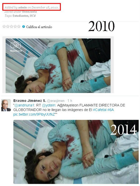 Cada día aparecen nuevos casos de manipulación que vamos añadiendo a esta lista que va camino de hacerse interminable, pero que creemos que es imprescindible para evidenciar los métodos que utiliza la derecha venezolana para intentar lograr sus objetivos. La siguiente foto de una estudiante herida, fue tomada en el año 2010 durante unos incidentes en la UCV en la que resultaron heridas varias personas. Una vez más, se hace pasar una vieja foto por una imagen actual y se acusa a la directora de Globovisión de no hacerse eco de la misma para, supuestamente, ocultar los hechos:
