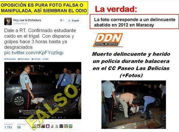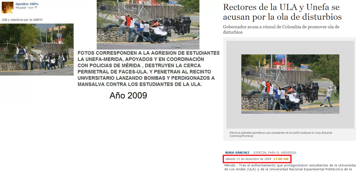 En las siguientes fotografías, el caso de manipulación llega al punto de publicar como actuales, imágenes en las que aparecen agentes de la Policía Metropolitana. Un cuerpo policial que fue disuelto hace varios años y que ya no existe en Venezuela. Además la primera fotografía se pretende hacer pasar por Mérida cuando en realidad se trata de Caracas.