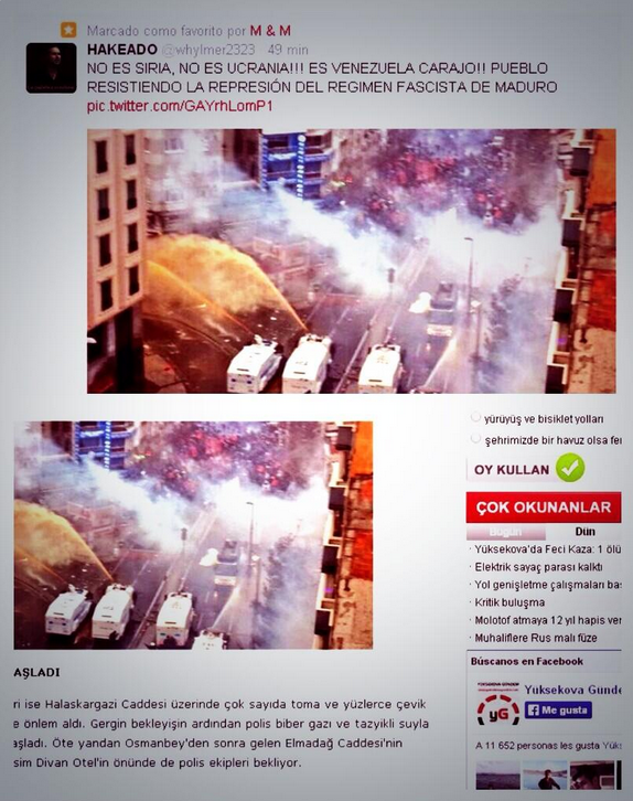 La fotografía que a continuación les mostramos, fue difundida a través de las redes sociales acompañada de textos en los que se indicaba que la imagen correspondía a Venezuela. Sin embargo, como se ha comprobado, en realidad están tomadas en Turquía durante recientes protestas que han tenido lugar en ese país: