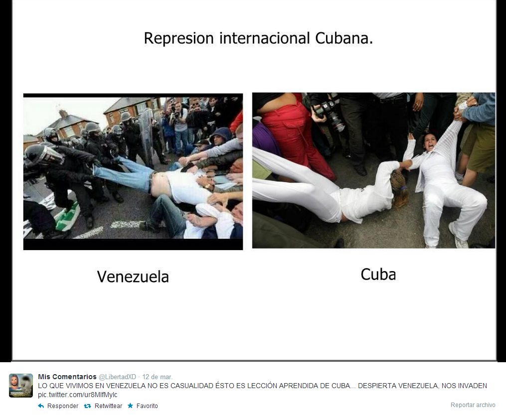 Twiteros opositores difunden fotografía de militares venezolanos con fusiles de francotirador, acompañándolas de textos en las que se insinúa que se trata de militares cubanos en suelo venezolano que disparan contra las manifestaciones estudiantiles. Como se puede observar en la imagen, la fotografía corresponde al 20 de Noviembre de 2013 en el contexto del dispositivo de seguridad desplegado en el Palacio Presidencial de Miraflores ante un evento oficial.