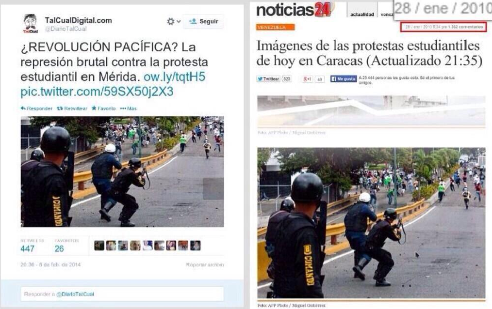 Un ejemplo más de la utilización por algunos usuarios de redes sociales, de fotografías antiguas y correspondientes a hechos que nada tiene que ver con los actuales y que pretenden hacer pasar como sucesos recientes en Venezuela: