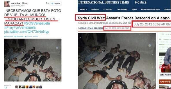 A continuación, twiteros opositores utilizan fotografías de la guerra de Siria acompañadas por textos en los que intentan hacer creer que esas imágenes corresponden a la represión contra los estudiantes en Venezuela: