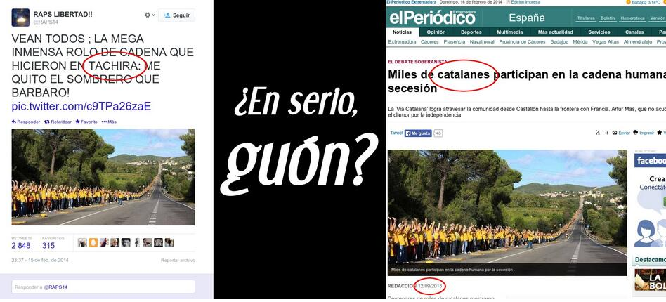 En la siguiente foto, han tratado de hacer pasar por una movilización de la oposición en Venezuela, la cadena humana que tuvo lugar en Septiembre de 2013 para pedir la independencia de Cataluña: