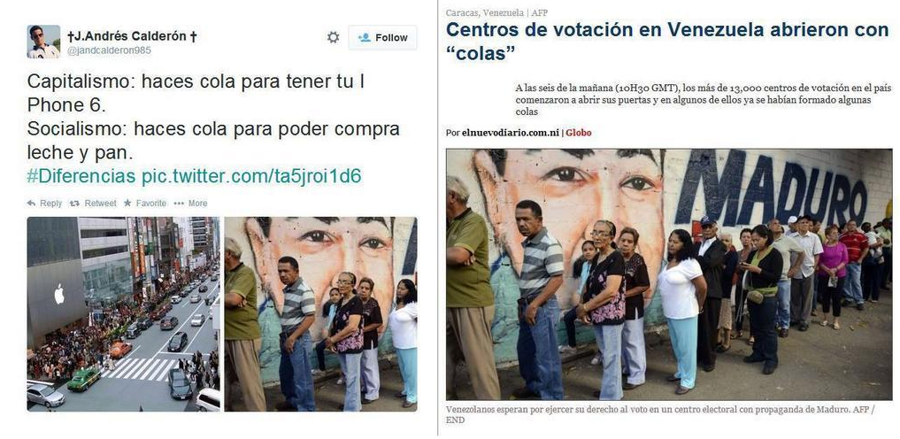 Aquí un conocido twittero ultracatólico y de derechas español, publica una supuesta foto de colas ante el desabastecimiento en Venezuela. Sin embargo la imagen corresponde a las colas formadas frente a los colegios electorales durante unos comicios en el país latinoamericano:
