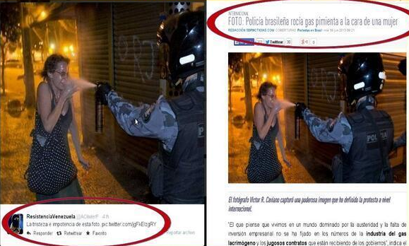 Nuevamente la manipulación vuelve a caer por su propio peso. Foto de protestas en Rio de Janeiro en Junio de 2013, hecha pasar por las protestas de estos días en Venezuela. Los uniformes de la policía y la propia fecha de publicación de la foto delatan la falsedad: