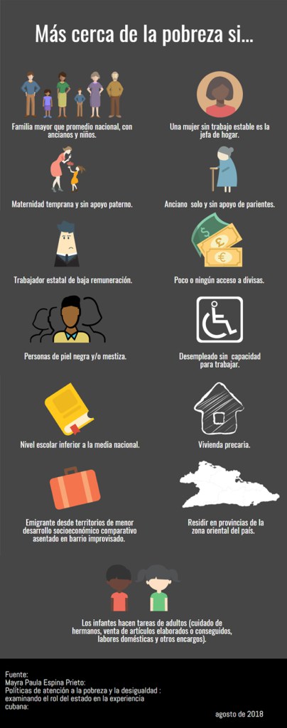 Estas personas serían los pobres en Cuba. Ellos y ellas, dice la profesora Mayra Paula Espina Prieto «gozan de servicios públicos de alta calidad, servicios que son exactamente los mismos a los que acceden todos los grupos de ingresos y que incluyen estudios universitarios, trasplantes de órganos, vacunas variadas». Insiste la socióloga cubana especializada en el tema de las desigualdades que la diferencia con el resto de la población del Archipiélago radica en que «les resulta muy difícil cubrir sus demandas de alimentos y otras necesidades básicas que se satisfacen en el hogar, en buena medida a través del mercado. A ello se suma la dificultad para disponer de una vivienda adecuada. Se trata de una situación en la que el ámbito de generación autónoma de medios propios para satisfacer necesidades y elegir sus satisfactores está seriamente dañado».
