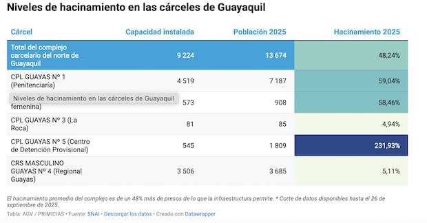 El complejo carcelario del norte de Guayaquil, que agrupa cinco prisiones, registra un crecimiento alarmante de decesos. Entre enero y agosto de 2025 se registraron 150 muertes de reclusos, de las cuales 21 fueron violentas, según el conteo preliminar del levantamiento de los cadáveres.