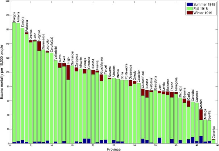 Fallecimientos por gripe española en tres períodos pandémicos. / Gerardo Chowell et al. CC BY