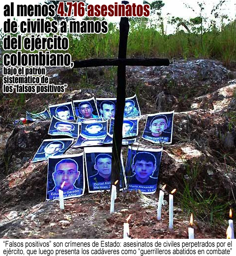 Hay una mediatización constante de cadáveres de jóvenes campesinos insurgentes que se hace de manera a que los cuerpos sean degradados, filmados en el suelo, a los pies de la tropa militar, en bolsas negras, y en reiteradas ocasiones con la exhibición descarnada de mutilaciones, para intentar deshumanizar al opositor político en el subconsciente colectivo: la degradación ética de los medios en su guerra sicológica llega al punto de que el presidente Santos exhibiera la mano cortada de un líder estudiantil devenido insurgente (Iván Ríos) [19]; como si el exhibir pedazos amputados de los opositores constituyera motivo de júbilo. El pago de recompensas por cadáveres busca involucrar a la población en la estrategia contrainsurgente del Estado, ampliando las prácticas del terror y la degradación ética. Los cadáveres son exhibidos con la intencionalidad macabra de generar la disuación por el terror preconizada en los manuales militares. En el marco de esta perversidad, el ejército colombiano ha llegado hasta el punto de secuestrar a niños y jóvenes de las zonas pauperizadas para luego asesinarlos en indefensión y aducir que son «guerrilleros abatidos en combate»: estas son practicas masivas, y se conocen con el macabro nombre de «falsos positivos»,derivado la jerga militar [20]. Hay al menos 4.716 casos documentados de estos asesinatos [21], y el reciente informe de DDHH del CINEP revela que estos crímenes siguen aumentando bajo el mandato de Santos, contrariamente a lo que la propaganda intenta hacer creer. El ejército tiene la estrategia de elegir a sus víctimas entre las familias que carecen de recursos económicos para investigar la desaparición de sus hijos; no obstante, varios familiares luchan por la justicia en medio del terror estatal que intenta forzarlos a abandonar las denuncias: hay familiares desplazados, algunos asesinados. La ampliación del Fuero Militar del gobierno Santos blinda la impunidad para los crímenes de Estado, haciendo aun más cruenta la indefensión de la población.