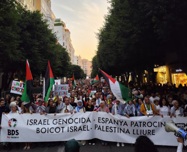 Fue la movilización más numerosa de las 36 celebradas en la capital valenciana desde el comienzo del genocidio, en octubre de 2023; cerca de 100.000 personas, según el BDS, recorrieron -desde la Plaza de Toros- las calles de la ciudad.