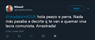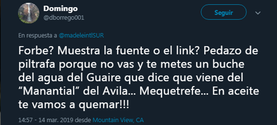 Quiero colocar, como un ejemplo reciente, algunos de los tuits que se emitieron en marzo pasado contra Madeleine García, periodista de Telesur, luego de trabajar en una cobertura en el estado Táchira, informando sobre la supuesta ayuda humanitaria que Juan Guaidó y grupos de oposición intentaban ingresar a Venezuela a la fuerza. Telesur mantuvo una línea editorial muy crítica en torno a esta supuesta ayuda humanitaria, y algunos tuiteros realizaron amenazas de grueso calibre contra sus periodistas, en particular contra García. Desconozco cuál sea su posición en torno a las leyes venezolanas contra los crímenes de odio.