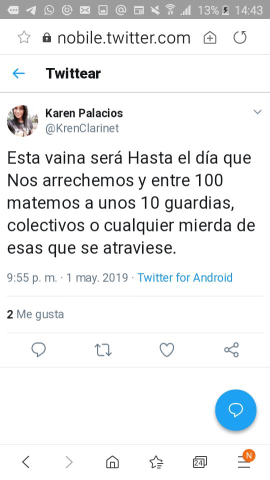 En otro tuit, escribió: «Esta vaina será Hasta el día que nos arrechemos y entre 100 matemos a unos 10 guardias, colectivos o cualquier mierda de esas que se atraviese».
