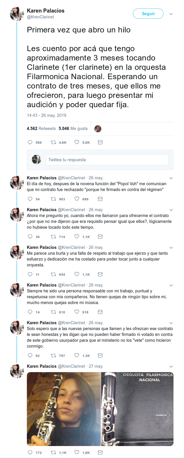 Días después, el 26 de mayo, Palacios escribió los tuits denunciando que no fue contratada en la Orquesta Filarmónica Nacional. Éstos fueron retuiteados por el periodista opositor Nelson Bocaranda (que tiene más de 3 millones de seguidores) y recibieron más de 4 mil retuits. En medio de la discusión pública entre chavistas y opositores por la supuesta discriminación política contra Karen, algunas personas descubrieron y visibilizaron sus otros tuits, con las consecuencias ya conocidas.
