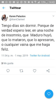Sin embargo, hay muchas cosas que no se están difundiendo con tanta vehemencia sobre este caso. La joven también emitió dos tuits el 1 de mayo, uno de ellos diciendo: «Tengo días sin dormir. Porque de verdad espero leer, en una noche de insomnio, que Maduro huyó, que lo mataron, que lo apresaron o cualquier vaina que me haga feliz«.