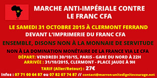 El pasado 31 de octubre una organización africana, los «marrons», los ilegales, había convocado una manifestación frente a la casa donde se imprime el Franco CFA en Clermont Ferrand, una bonita ciudad situada en el centro de Francia, unos 400 kilómetros al sur de Paris, con lemas como «Movilización contra la estafa monetaria del FCFA» o «Marcha anti imperial contra el Franco CFA», «Juntos digamos no a la moneda de la servidumbre», «No a la dominación monetaria de Francia a través del FCFA», «No al franco de las colonias francesas de África» y alguno apelando a los propios franceses, que seguro desconocen este juego sucio de su gran nación, «Africanos y franceses, todos unidos contra la inmigración, la explotación y el pillaje», los marrons gritaban sin parar «unidad, dignidad y coraje».