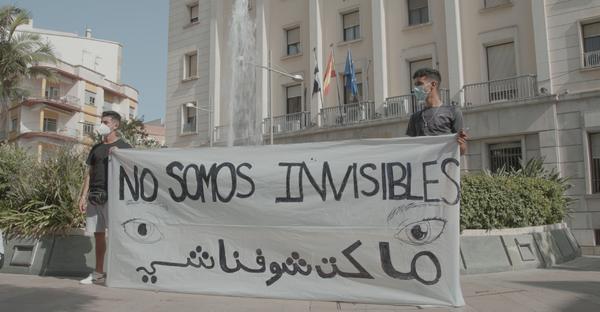 Sábado 17 de julio. Decenas de jóvenes y adolescentes, unos pocos niños, están sentados en el suelo de la Plaza de los Reyes, en la Ciudad Autónoma de Ceuta, frente a la Delegación del gobierno. La mayoría de ellos son marroquíes, están distribuidos en hileras, guardando la distancia de seguridad. Frente a los chavales, con el edificio de fondo y la policía quieta y vigilante a la derecha, dos compañeros muestran una pancarta que dice en castellano y dariya —el árabe de Marruecos— “No somos invisibles”. Del otro lado de la plaza, otro cartel sostenido por otros dos muchachos recuerda: “Solo somos víctimas de sus políticas”.