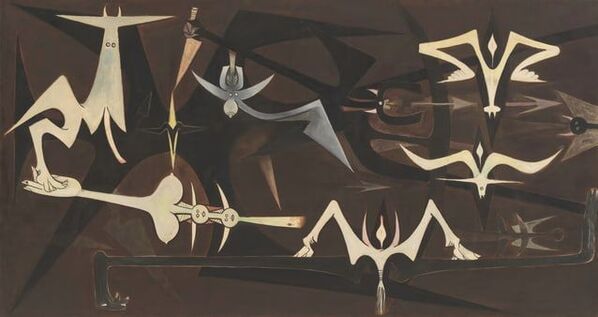 A medida que avanzaba por las salas de la exposición y más artistas de América Latina, el Caribe y los Estados Unidos, un país racialmente segregado, se unían al coro visual, quedó claro que esta voluntad de mirar lo monstruoso era también la razón por la que el surrealismo se extendió tan fácilmente a partes del mundo devastadas por la violencia estatal e imperial. En Rumblings of the Earth (1950), el artista cubano Wifredo Lam se inspiró en el Guernica de Picasso para capturar el sufrimiento que España infligió a sus colonias, mucho antes de que ese horror regresara a casa durante la Guerra Civil Española. Repleta de partes de cuerpos humanos y no humanos afiladas en forma de cuchillas, hachas y amuletos, la pintura es descrita por el curador Zach Ngin como «una representación visual del «terrible efecto boomerang» de Aimé Césaire». Observa: «La víctima de Guernica, el caballo, es sustituida en Rumblings por lo que Lam describió como un «pájaro diabólico» que lanza cuchillos y flechas. La perpleja víctima del fascismo se revela también como perpetradora».