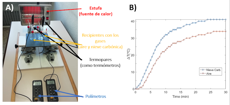 El de Eunice era un experimento bastante sencillo que se puede realizar fácilmente en casa. De hecho, la figura 1, correspondiente a un experimento similar realizado por los autores de este artículo durante la Noche Europea de los Investigadores de este año, muestra cómo la temperatura medida en recipientes con CO₂ en su interior aumenta más que en aquellos que sólo tienen aire.
