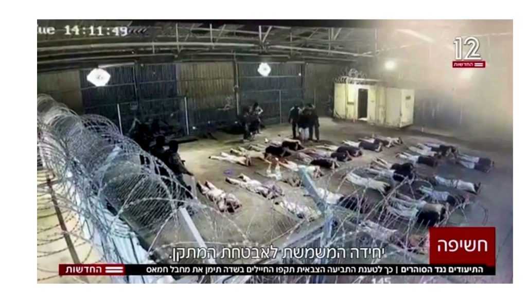 Este vídeo de DemocracyNow muestra la sistemática tortura y violación en la prisión de Sde Teiman llamada por los prisioneros / rehenes palestinos –El Matadero y el Campo de Concentración de Tortura”-,  donde  se utilizan “métodos de tortura diseñados” como métodos de venganza y tácticas para afirmar el control y la superioridad, y muestra como la población israelí se manifiesta para proteger al ejército. Estos soldados israelíes abusadores se presentaron frente a la Corte Suprema en Jerusalén, con máscaras, como víctimas por justamente servir al Estado.