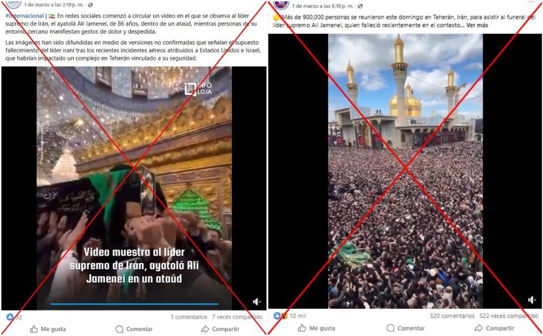 En esta misma línea de descontextualización, se han difundido vídeos de supuestas multitudes rindiendo homenaje en el funeral de Jamenei en Teherán. Aunque la capital iraní sí registró concentraciones de duelo simbólico, los vídeos virales corresponden en realidad a sepelios celebrados en Irak semanas antes del inicio de la guerra, como el entierro del hermano del gran ayatolah Ali al-Sistani o rituales religiosos en Bagdad en honor al imán Musa al-Kadhim.