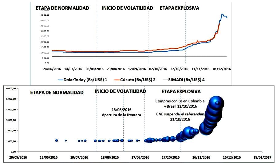 El efecto de estos eventos lo podemos observar en la Grafica N°2 (la misma se subdivide en dos gráficas, que por simplicidad la diferenciaremos como sub-gráfica superior y sub-gráfica inferior), allí podemos detallar que la pendiente constante de los precios de los marcadores no oficiales cambiaron a un crecimiento exponencial, esto se evidencia en las dos sub-gráficas, de hecho si nos detenemos en la sub-grafica inferior, allí se tiene el comportamiento del precio expresado en variación inter-diaria, mientras más grande es el diámetro de los círculos implica una mayor variación en comparación con el día anterior. En estas gráficas se evidencia que la apertura de la frontera con Colombia, la venta de productos emprendido por el PAC y la suspensión del referéndum revocatorio fueron eventos que presionaron el alza del dólar paralelo (Dolartoday y Cúcuta).