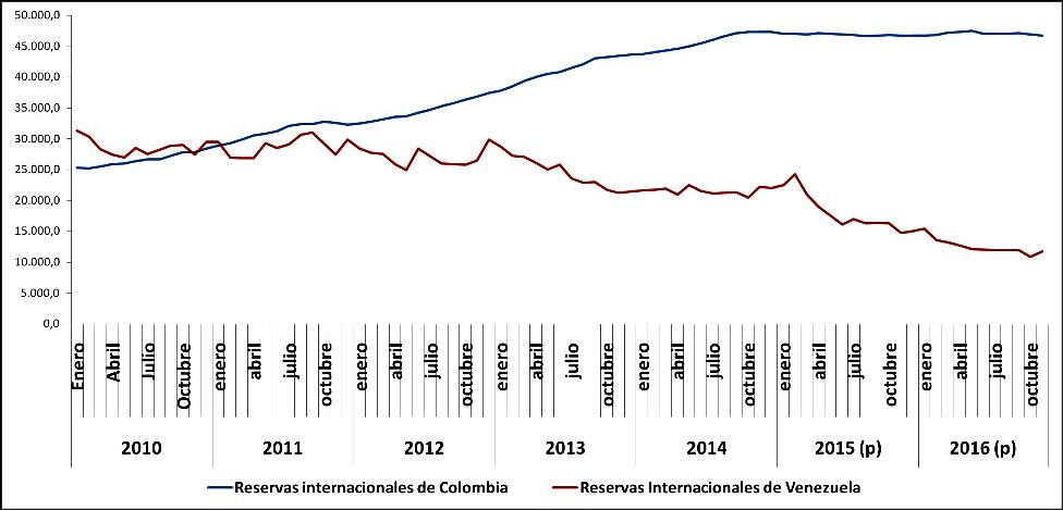 Reservas internacionales de Colombia vs Reservas Internacionales de Venezuela