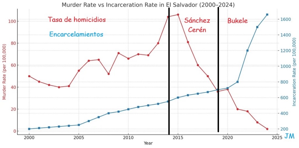 La primera expresión no tiene nada de ambigua. Bukele y El Salvador son “el ejemplo” para discutir la seguridad. ¿Necesitamos un teólogo para interpretar esto? Si hubiese dicho “en materia de seguridad, Cuba es el ejemplo” no habría quedado duda. ¿Por qué no decirlo? Cuba ha tenido una tasa de criminalidad históricamente muy baja. O Chile, cuya tasa de homicidios es la mitad de la de Uruguay. ¿Por qué El Salvador? Más que El Salvador, ¿por qué “el ejemplo es Bukele”, a pesar de que la dramática reducción de los homicidios se produjo en el gobierno de Sánchez Cerén y sin recurrir a los campos de concentración ―su pecado fue desafiar a las corporaciones. Pero, no sin ironía, Bukele ofrece otro ejemplo de la palestinización del mundo que estamos viendo, incluso en Estados Unidos: brutalidad sin ley, cárceles coloniales y datos a la medida del consumidor, como reportar asesinatos como suicidios o accidentes.