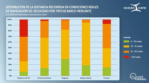 Según los datos del análisis –llevado a cabo por Quiet Oceans y encargado por OceanCare– el comportamiento general de navegación de los buques, especialmente en términos de velocidades medias, se mantiene estable en ambos años. De los casi 48 millones de kilómetros recorridos por el conjunto de los barcos que navegaron por aguas de esta ZMES en 2023 y en 2024, el 57 % de la distancia total recorrida se realizó a velocidades superiores a 10 nudos, sin variaciones significativas entre ambos años (56,9 % en 2023 y 57,5 % en 2024).