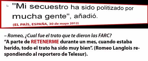– TeleSur ha entrevistado en directo y en exclusiva a Romero Langlois y él habla de «mi retención». Sin embargo El País, tomando la fuente de TeleSur (tal y como reconocen en el propio artículo) cambia las palabras y dice «mi secuestro», agrega el reportero vasco que acaba de estrenar un nuevo documental, «Colombia invisible«, de 65 minutos sobre las raíces del conflicto en Colombia que pronto será distribuido por MUNDUBAT. Eso sí es periodismo de alto nivel.