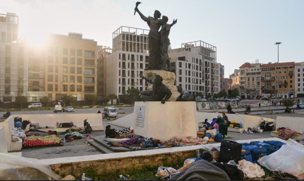 Las autoridades de Beirut no han hecho nada para ayudarlos, dice Fátima. Forman parte de una amplia franja de la población libanesa que ha sido desarraigada y son una de las decenas de familias que han encontrado refugio cerca de la gigantesca estatua de la luna creciente. Unos hombres les trajeron mantas cuando vieron que la familia tenía frío. El problema es que ahora no tienen adónde ir. «Ahora tenemos miedo de volver. Dicen que hay bombardeos. Así que nos vemos obligados a quedarnos aquí sentados en el suelo. ¿Qué podemos hacer? No hay solución. No hay nada», dice.