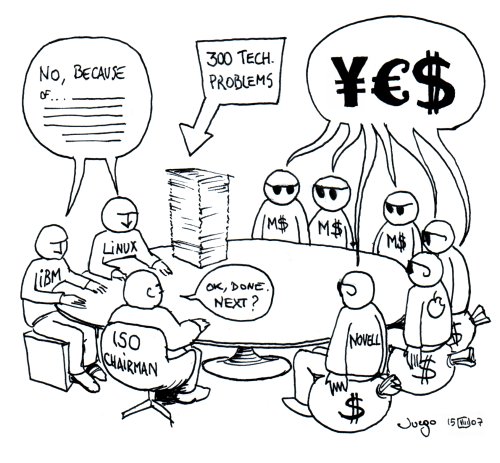 | Una de las caricaturas surgidas en 2008 protestando en contra de que la ISO acepte el formato de Microsoft OOXML como estándar abierto. |