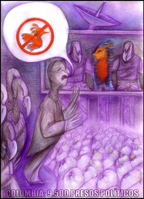Paralelamente a la huelga de hambre nacional, el cinismo del estado llegó a tales niveles que voceros del gobierno salieron a negar la existencia de presos políticos en Colombia [11], cuando es bien sabido que hay miles de hombres y mujeres condenados por el«delito de rebelión» -tipificado en el mismo código- y condenados asimismo por su extensión más arbitraria de «terrorismo«, una categoría conceptual en la que cabe todo lo que le moleste al estado [12] y al gran capital de un país saqueado que busca ahogar el descontento social en el exterminio y entre rejas. De los 9.500 presos políticos que tiene el estado colombiano, se estima que cerca del 90% son civiles encarcelados por su actividad política, su pensamiento crítico, su oposición a las políticas depredadoras del medio ambiente: sindicalistas, ambientalistas, maestros, líderes agrarios, académicos críticos, abogados, médicos, defensores de derechos humanos… hasta los artistas son objeto de la persecución judicial [13]. Por otro lado, también es bien sabido que en Colombia hay un conflicto social, político y armado, y que en ese marco, los insurgentes apresados por el estado son presos políticos de guerra, porque su reivindicación es eminentemente política y porque hay una guerra. Pero el estado colombiano intenta tapar el sol con un dedo.