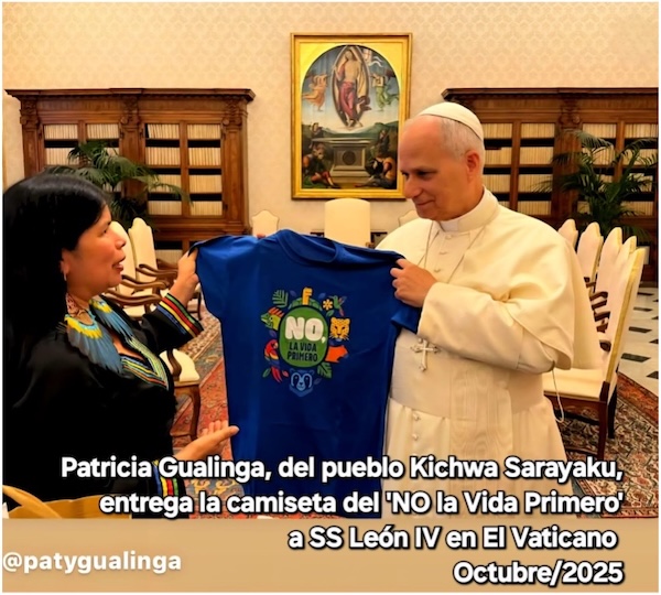 Patricia Gualinga –indígena originaria de Riobamba, defensora de los derechos humanos y ambientales– tuvo un encuentro con el papa León 14 en días recientes. En esta ocasión le regaló al papa León una camiseta cuyo dibujo estampado resalta el ‘NO’ acompañado de la expresión ‘La vida primero’, rodeado de imágenes de plantas y animales.