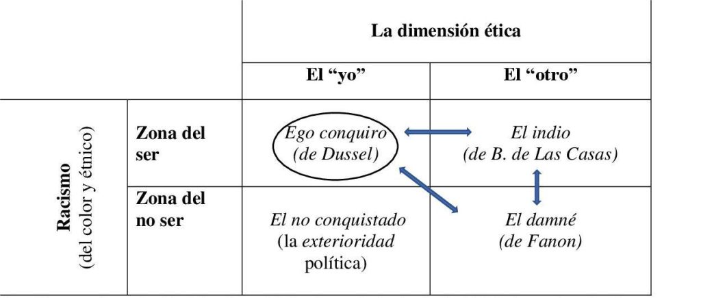 El Cuadro 1 resume esta configuración del ser, de su multiplicidad – no de su unidad como si se tratara del Uno– combinando la entrada ética propuesta por Dussel con la línea del ser propia del racismo sugerida por Fanon. Mirada desde el “yo ser”, es decir, desde el ego conquiro, es posible hacer comprensivo el orden biopolítico, el lugar político-cultural de cada sujeto, que se consolida en la América española de fines del siglo XIV.