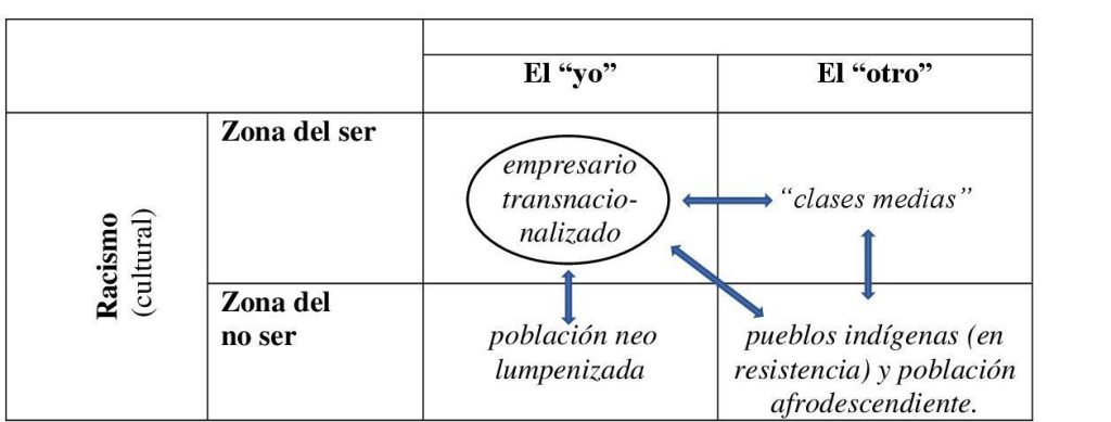 Por otra parte, por bajo la línea del ser, en momentos en que el racismo vuelve a manifestarse abiertamente con las migraciones masivas, los “indios” de hoy despliegan como ayer “malones”, resistiendo al capital en defensa de sus territorios, sus recursos y su identidad cultural fortalecida al liberarse de la etiqueta de campesinos. Entre todo, una masa urbana informe que sin referentes utópicos pero investida de un narcicismo extremo (un “yo” acentuado), remedo mediocre de las maras, circula entre el autoempleo y la delincuencia. No se trata del bandolerismo social de inicios del siglo XX, sino de una población incluida subjetivamente en el mercado, pero objetivamente excluida de la vida legal, una masa que comienza a crecer del microtráfico y de toda la estructura de empleos de la economía delincuencial.