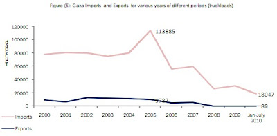 En realidad, el resultado fue una prohibición casi total de exportación que ha devastado Gaza e imposibilitado cualquier tipo de recuperación económica. El cuadro siguiente, tomado de un informe de 2010 del Centro de Comercio Palestino, muestra las tendencias anuales de exportación de junio de 2006 a julio de 2010.