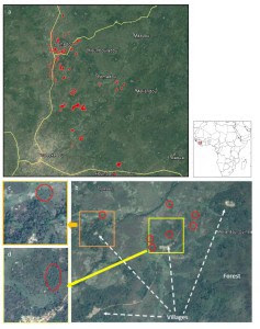 En la parte superior de la Figura 1 se muestra una serie de parcelas de palma aceitera en la zona de Guéckédou, donde comenzó aparentemente la epidemia. El paisaje característico es el de un mosaico de pueblos rodeados por una densa vegetación e intercalados campos de cultivo de palma aceitera (en rojo), con zonas de bosque abierto y bosque joven regenerado.