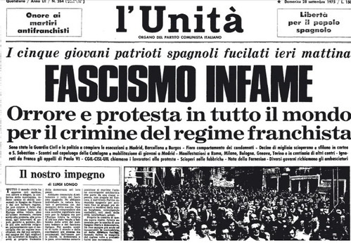 Cuando el gobierno franquista amplió su larga lista de crímenes con los fusilamientos del 27 de septiembre, el diario L’Unità, órgano del PCI, encabezó su portada con un titular claro y rotundo: “Fascismo infame”. Las movilizaciones se intensificaron y estalló la tensión acumulada. En Roma, una nueva manifestación reunió a 150.000 personas y varios autobuses turísticos con matrícula española fueron incendiados cerca de la estación Termini.