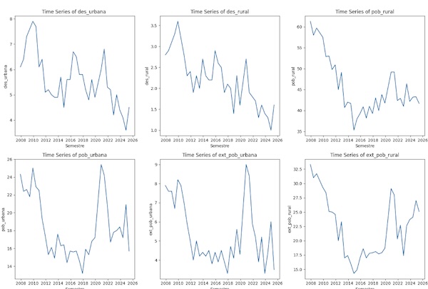 En la figura 1, los dos primeros paneles de la parte superior muestran el comportamiento del desempleo a nivel urbano y rural, en los dos casos se aprecia una tendencia decreciente a partir del 2010. A continuación, las series de pobreza rural y urbana se aprecian dos momentos, el primero de 2007 al 2016 con una marcada tendencia descendente, es decir se redujo la pobreza. Hay que destacar que este periodo estuvo marcado por fuerte inversión social por parte del gobierno que funcionó como herramienta de redistribución eficiente. A partir de 2017 estas variables cambian notablemente su dirección, la tendencia en el tiempo muestra como a partir de ese año hasta junio de 2025 se incrementó la pobreza a nivel rural y urbano. El cambio del rumbo ideológico, económico y político, la reducción de la inversión social, flexibilización laboral y otras acciones de doctrina neoliberal, muestra inmediatamente sus resultados. La extrema pobreza a nivel rural y urbano tienen el mismo comportamiento, dos momentos claramente marcados.