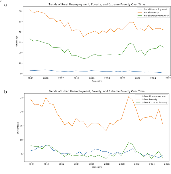 La figura 2, cuenta con dos paneles, en el superior (a), se muestran a nivel rural el desempleo, extrema pobreza y pobreza. La línea casi horizontal y sin variaciones extremas del desempleo indica el bajo nivel de desempleo en la ruralidad, por otra parte, la pobreza y pobreza extrema varían en dos tendencias un primer tramo descendente y un siguiente tramo con tendencia ascendente.
