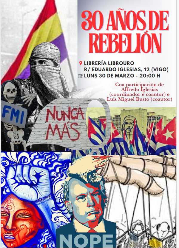 La librería Librouro acogerá el lunes 30 de marzo, a las 20:00, la presentación del libro 30 años de Rebelión, de la editorial Dyskolo. El acto contará con la presencia del vigués Alfredo Iglesias Diéguez, colaborador del Faro da Cultura y coordinador del libro, del que también es coautor junto con otras 29 personas que representan el pasado y el presente del periódico digital Rebelión, del que es miembro del consejo editorial. En el acto también participará Luis Miguel Busto Mauleón, coautor del libro y miembro del consejo editorial de Rebelión.