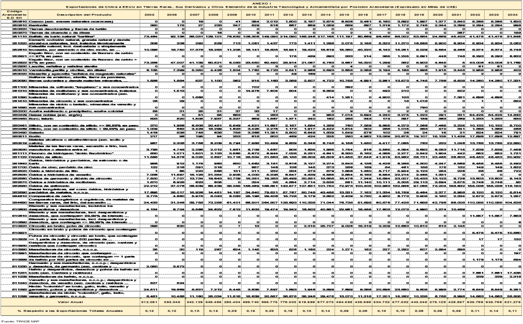 De lo publicado en esta materia, se pudo determinar que de las tierras llamadas raras junto con otros elementos derivados de ellas y minerales que entran en ese radio de acción por la aplicación de la industria (Ver Anexo I), las llamadas tierras raras, representaron en promedio el 0,12% de las exportaciones procedentes de China con destino hacia los EEUU entre 2005 y 2024. Por otra parte, como estamos haciendo uso de un promedio, pudiera existir un crecimiento del valor exportado entre estos años que no se vea representado y perturbe la representatividad de dicho promedio, por lo que, se le calculó la desviación estándar de los valores con respecto a su promedio y dicha desviación es del 0.039, muy baja, que la convierte en muy representativa, pues, no hay una gran variación entre años de la serie temporal, que introduzca perturbación en el uso del promedio.