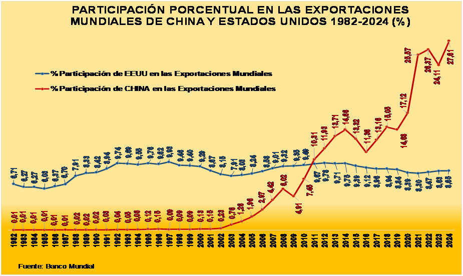 De acuerdo a la serie en estudio desde el año 1982 en términos reales a precios de 2015, según cifras del Banco Mundial, China inició desde 2011 con una participación del 10,31% la ocupa tímidamente de la posición número uno en el ranking mundial del comercio, como el principal país exportador del planeta, para pasar en 2024 a tener una participación del 27,61%. Para el mismo período, en términos reales a precios de 2015, los Estados Unidos tuvieron una participación en las exportaciones mundiales que ha oscilado entre el 6,71% para 1982 y del 8,65% para 2024. (Ver Gráfico N° 1)