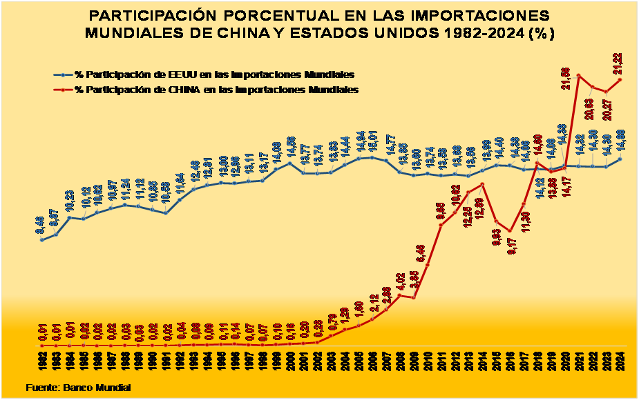 Por su parte, en la corriente comercial de las importaciones mundiales, a precios constantes de 2015, en la serie de estudio 1982 a 2024, no fue sino hasta el 2021 cuando China pasó a ocupar la primera posición como importador mundial con el 21,56% y en 2024 tras leves descensos tuvo una participación del 21,22% a nivel mundial. Por su parte, los Estados Unidos, tuvieron una participación en las importaciones mundiales, bajo los mismos términos de medición, donde paso de representar en 1982 el 8,46% de las importaciones mundiales a 14,88% en 2024. (Ver Gráfico N° 2)