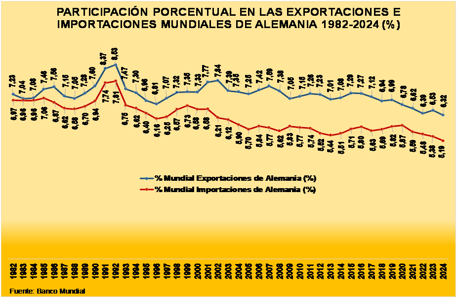 En materia de comercio mundial, al país asiático no se le ven competidores muy cercanos, mientras que a EEUU sí, pues se encuentra bastante amenazado por Alemania (Ver Gráfico N° 3), quien registra el 6,32% de las exportaciones mundiales para 2024 y el 5,19% de las importaciones mundiales en 2024.