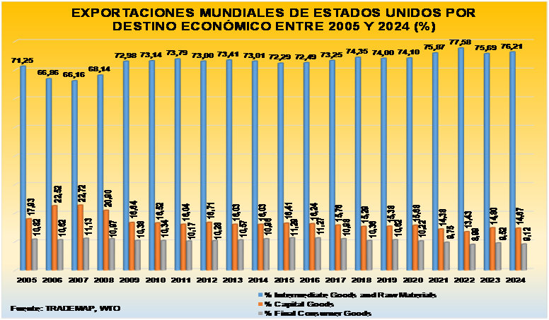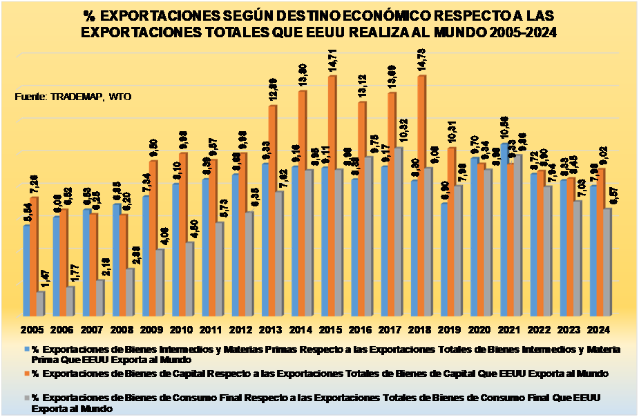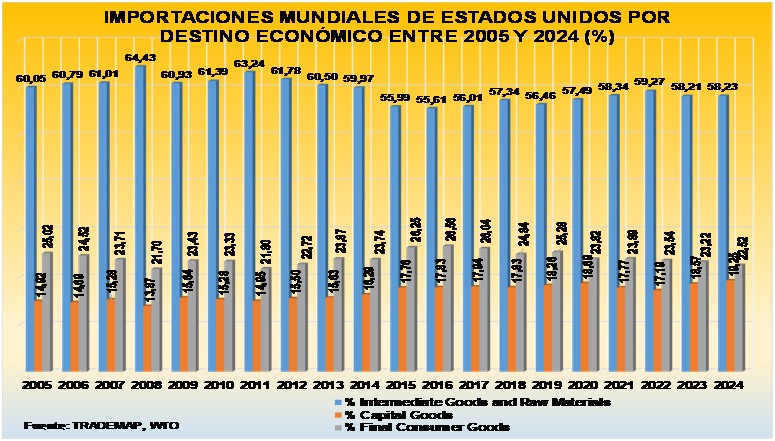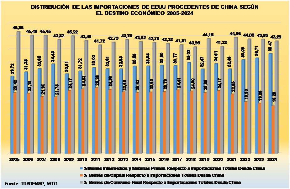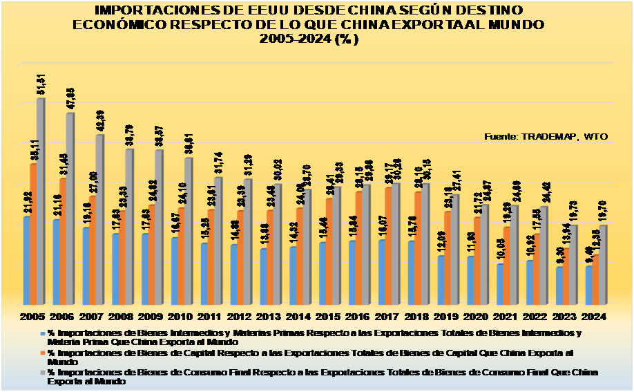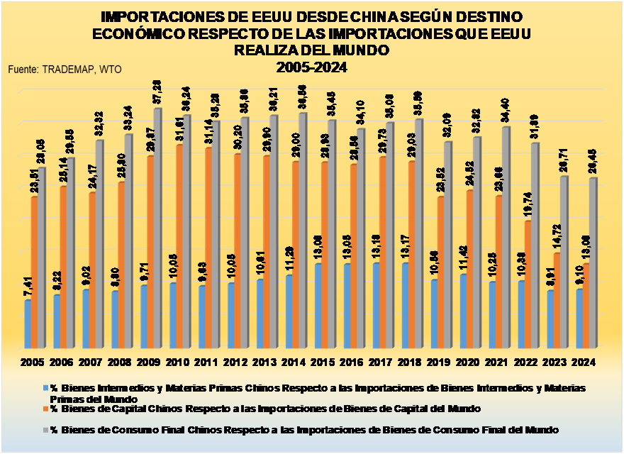 Entre 2005 y 2024, lo que respecta a bienes de capital y bienes de consumo final, tuvieron importantes oscilaciones al alza en las importaciones norteamericanas desde China respecto de las que efectuó del mundo, hasta descender en 2024 a 13,08% las importaciones de bienes de capital respecto de lo que hizo del mundo y 26,45% en las importaciones de bienes de consumo final que EEUU realizó desde China, ante lo que importó del mundo. Por su parte, las importaciones de bienes intermedios y materia prima, tuvieron un comportamiento más ajustado, denotando pequeñas oscilaciones que han de corresponderse con adaptaciones de la planificación a los vaivenes de la política norteamericana. Nótese, que existe cierta estabilidad en las importaciones de Bienes de Consumo Intermedio y materias primas, en lo que respecta a lo importado por EEUU del resto del mundo.