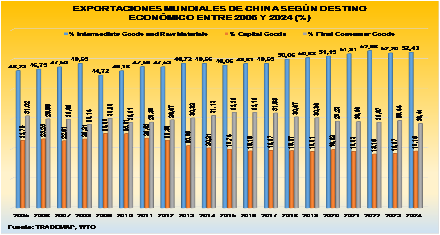 En el Gráfico N° 6 y Gráfico N° 7, se muestran las exportaciones e importaciones con el mundo de China, según el destino económico de los bienes.