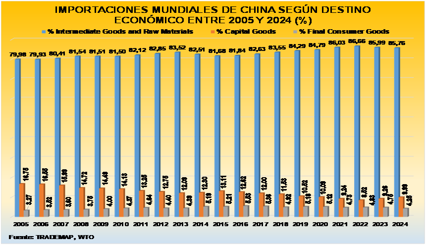 En el Gráfico N° 6, vemos que las exportaciones chinas al mundo se orientan en promedio para el período 2005 a 2024, según destino económico, 48,96% a bienes de consumo intermedio y materias primas, 21,02% a bienes de capital y 30,02% a bienes de consumo final. El Gráfico N° 7, nos indica que sus importaciones se dirigen en promedio para el mismo período y por destino económico, 82,95% son bienes de consumo intermedio y materias primas, 12,49% son bienes de capital y 4,55% son bienes de consumo final, esos números, solo indican que ese país, no está jugando, y si lo está haciendo, va muy en serio en ese juego.
